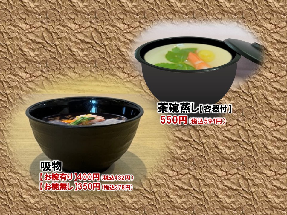 トップページ > お品書き > 吸物・茶碗蒸しセット【使い切り容器付き】